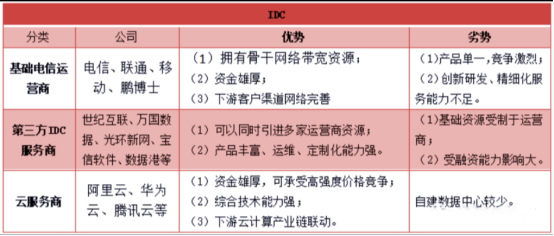 IDC competitors are divided into three categories: telecom operators, third-party IDC service providers and cloud service providers.