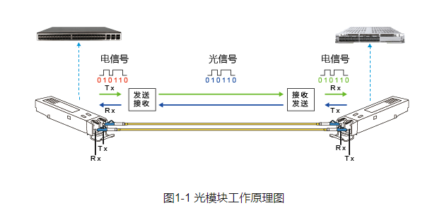 The transmitting interface inputs an electrical signal with a certain code rate. After being processed by the internal driving chip, the driving semiconductor laser (LD) or light emitting diode (LED) transmits the modulated optical signal with the corresponding rate. After being transmitted through the optical fiber, the receiving interface converts the optical signal from the optical detection diode into an electrical signal, and outputs the electrical signal with the corresponding code rate after passing through the preamplifier.